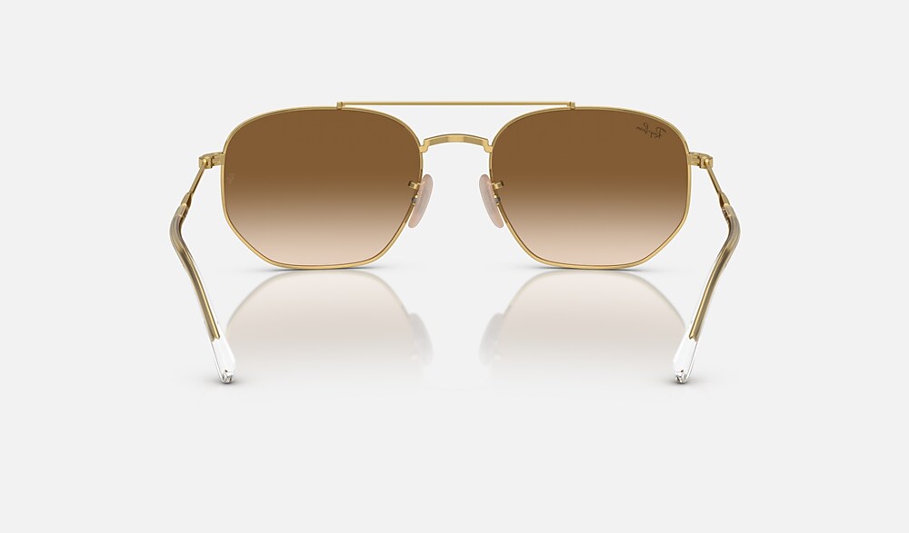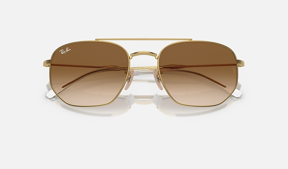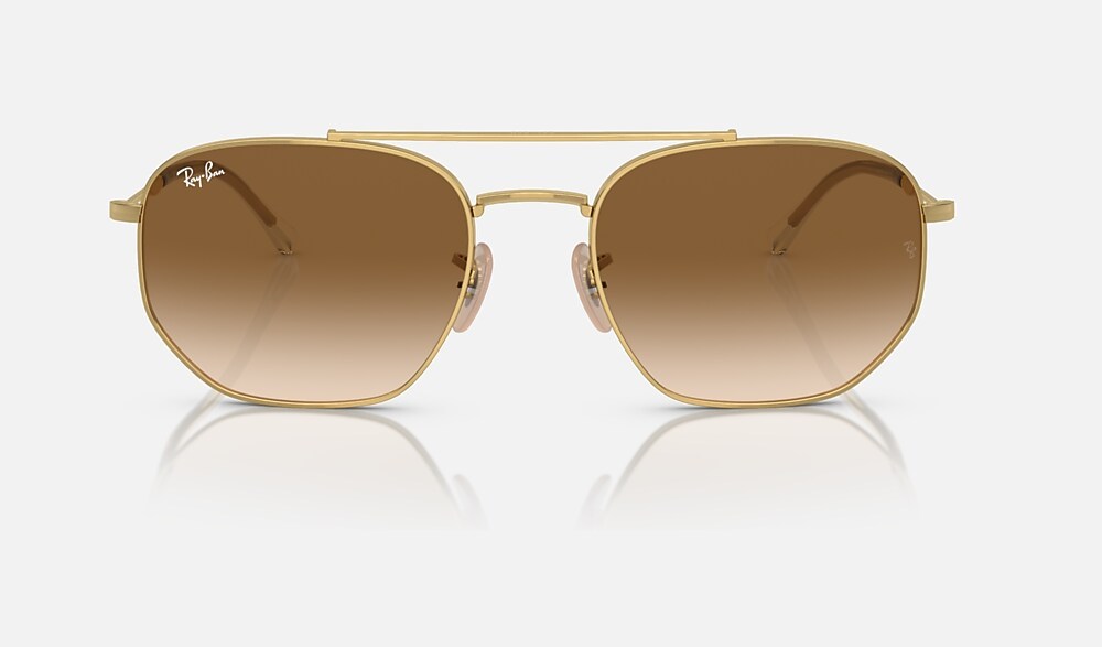 Ray-Ban RB3707 sunglasses are a new take on a timeless shape. Made from metal, with irregular lenses and a gold frame, these Sunglasses are polished and modern. The lenses are brown, while the temples are gold.